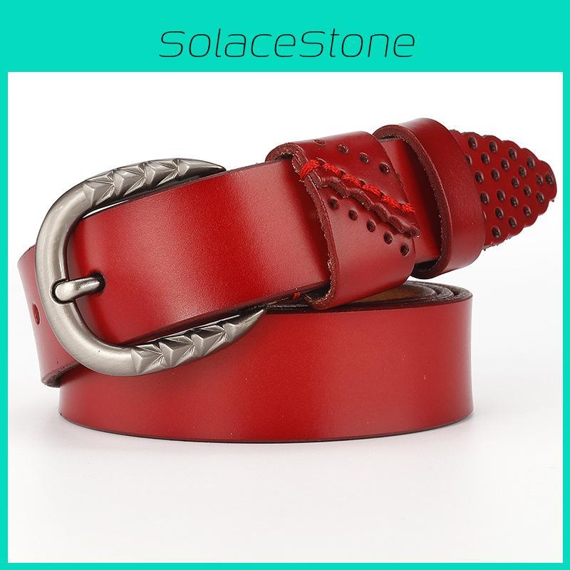 This women's leather waist strap features genuine two-layer cowhide material, offering durability and a refined look. It measures 2-4 cm in width and is available in lengths of 105, 110, 115, and 120 cm, with a metal needle buckle for secure fastening. Its simple solid color and trendy buckle accent make it suitable for casual and streetwear outfits. Ideal for enhancing everyday attire, it can be worn at waist or hips. Wipe clean with a damp cloth to maintain its appearance.