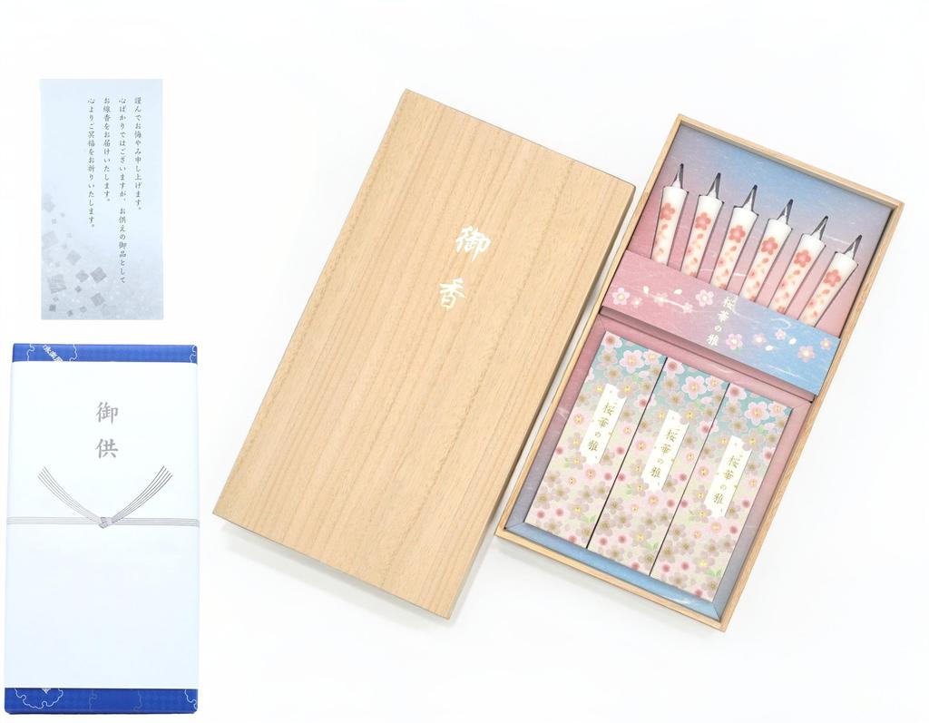 [Includes a Condolence Note] Sakuraka No Miyabi Incense Set, Light Smoke, Incense and Illustrated Candle Set, Presented In a Premium Paulownia Wood