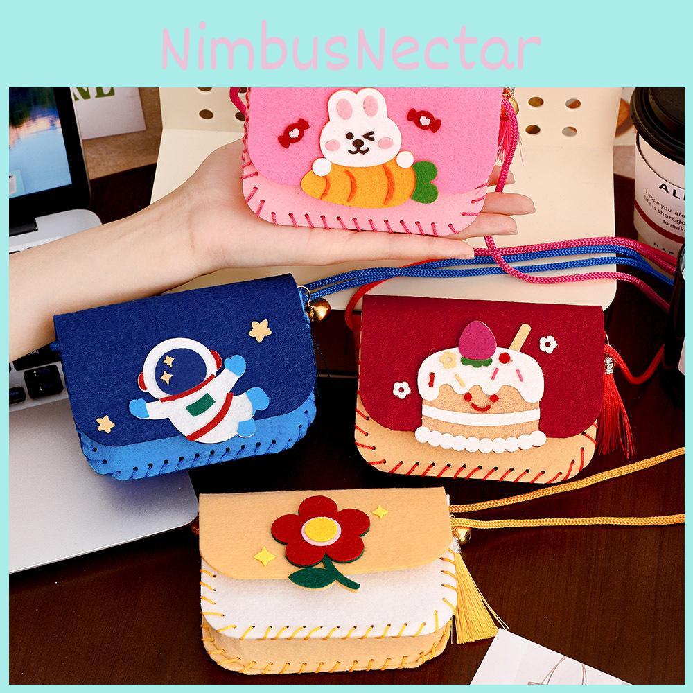 This children's DIY crossbody bag kit features fabric materials, designed for easy hand-sewing. The kit includes colorful fabric pieces in strawberry cake, space explorer, star wish, and milky rabbit themes, perfect for creative projects. Ideal for preschool activities or parent-child bonding, it encourages fine motor skills and imagination. Wipe clean with a damp cloth to maintain the fabric.