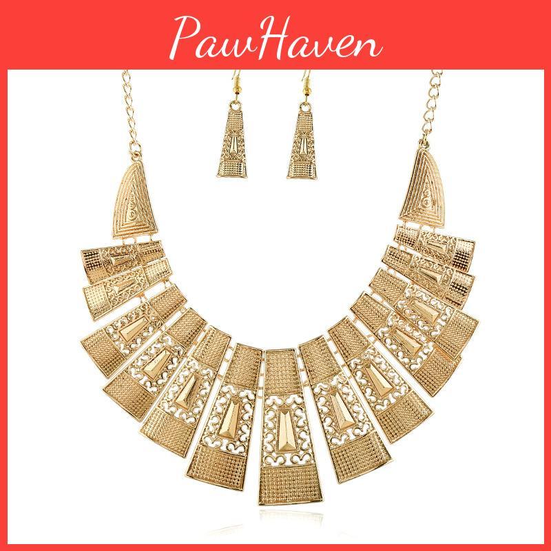 This vintage-inspired jewelry set features a geometric alloy design with hollow accents, including a necklace and matching earrings. and available in white gold, gold, rose gold, and antique silver colors. Ideal for adding a distinctive touch to casual or formal outfits,To maintain its appearance, wipe clean with a soft cloth.