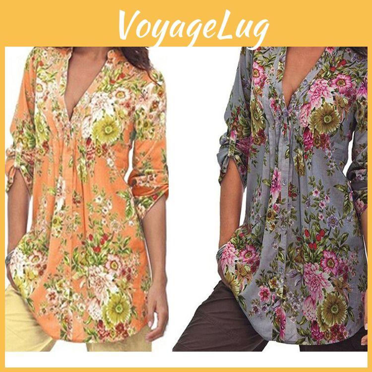 Women Tops Shirt Vintage Floral Print V Neck Tunic Tops Blouse Gift Clothing