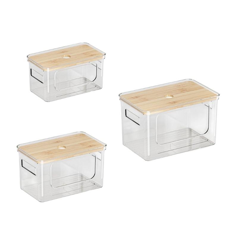 Its clear PET construction allows quick visibility of contents, paired with a user friendly bamboos cover for dust proof protections and modern aesthetic.