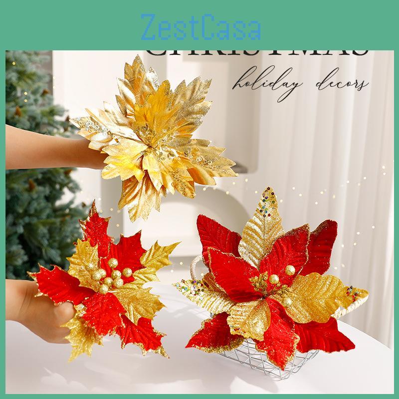 This Christmas decorative flower arrangement features preserved flowers made from durable materials, designed to enhance holiday displays. Available in sizes such as large red and gold with sharp petal accents, it measures approximately 12 inches in height and 8 inches in width. Crafted with attention to detail, it adds elegance to festive settings. Ideal for tabletop decor or wreath embellishments during Christmas celebrations, it maintains its beauty with simple wiping using a damp cloth for easy upkeep.