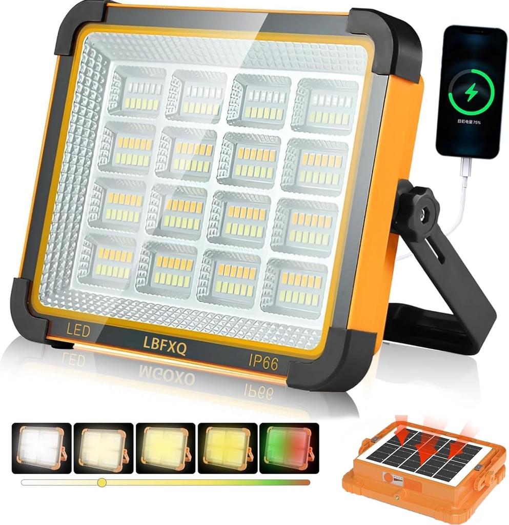 [High-Brightness LED Flood Light] This ultra-bright LED floodlight is equipped with 466 high-quality SMD chips. Simply press the mode switch button to easily cycle through five modes: 1) Daylight White, 2) Warm White, 3) 100% Natural White, 4) 50% Natural White, and 5) (SOS) Red and Blue Flashing. The rechargeable LED floodlight's bracket can be rotated 180 degrees, giving the LED floodlight a 120-degree light angle, allowing for versatile angle adjustment.