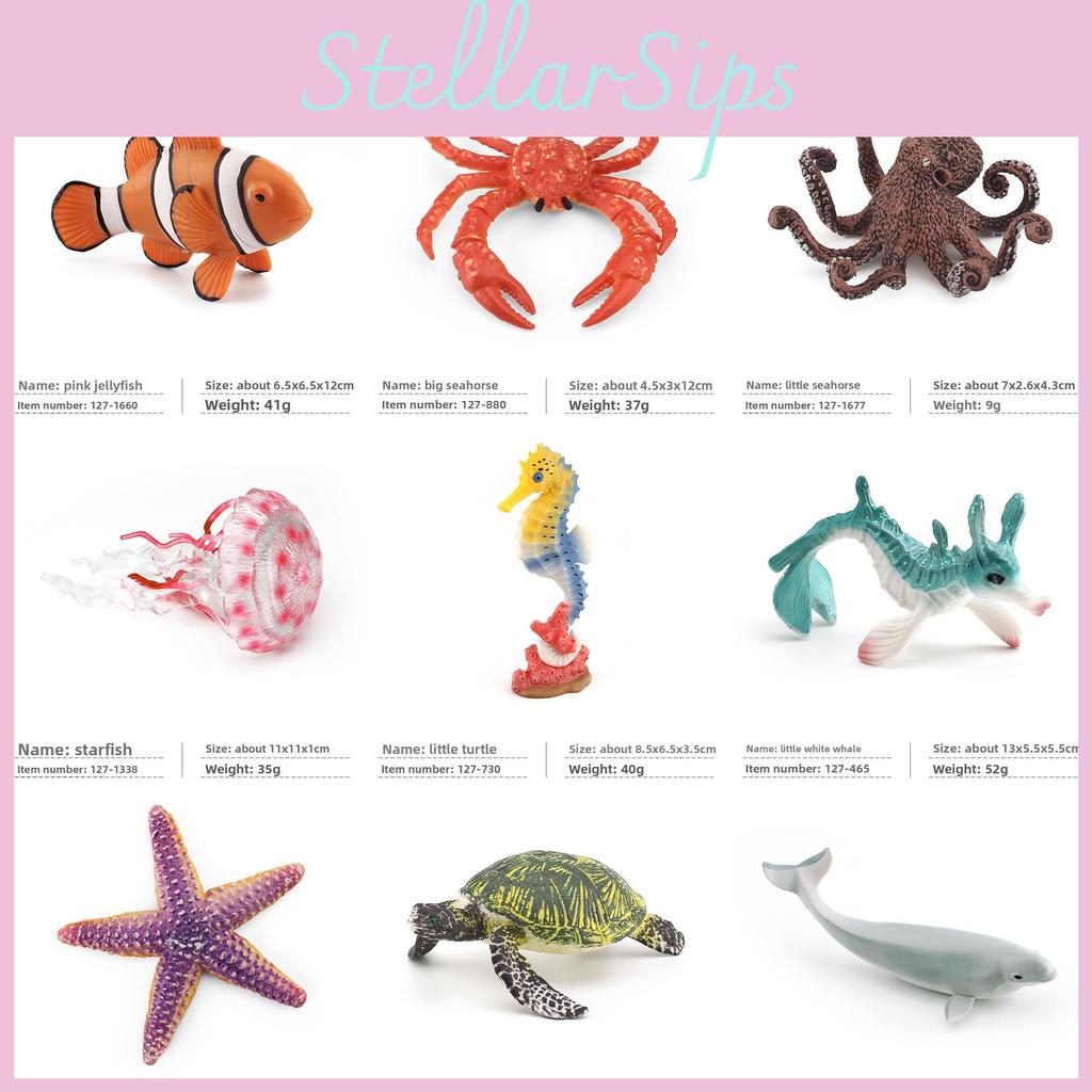 This collection features detailed PVC marine animal models, including a white whale, clownfish, octopus, sea turtle, king crab, seahorse, starfish, and jellyfish.showcases realistic craftsmanship for display purposes. Ideal for educational displays, aquariums, or marine-themed decor, these static figurines require no assembly. To maintain their vibrant appearance, wipe clean with a damp cloth.