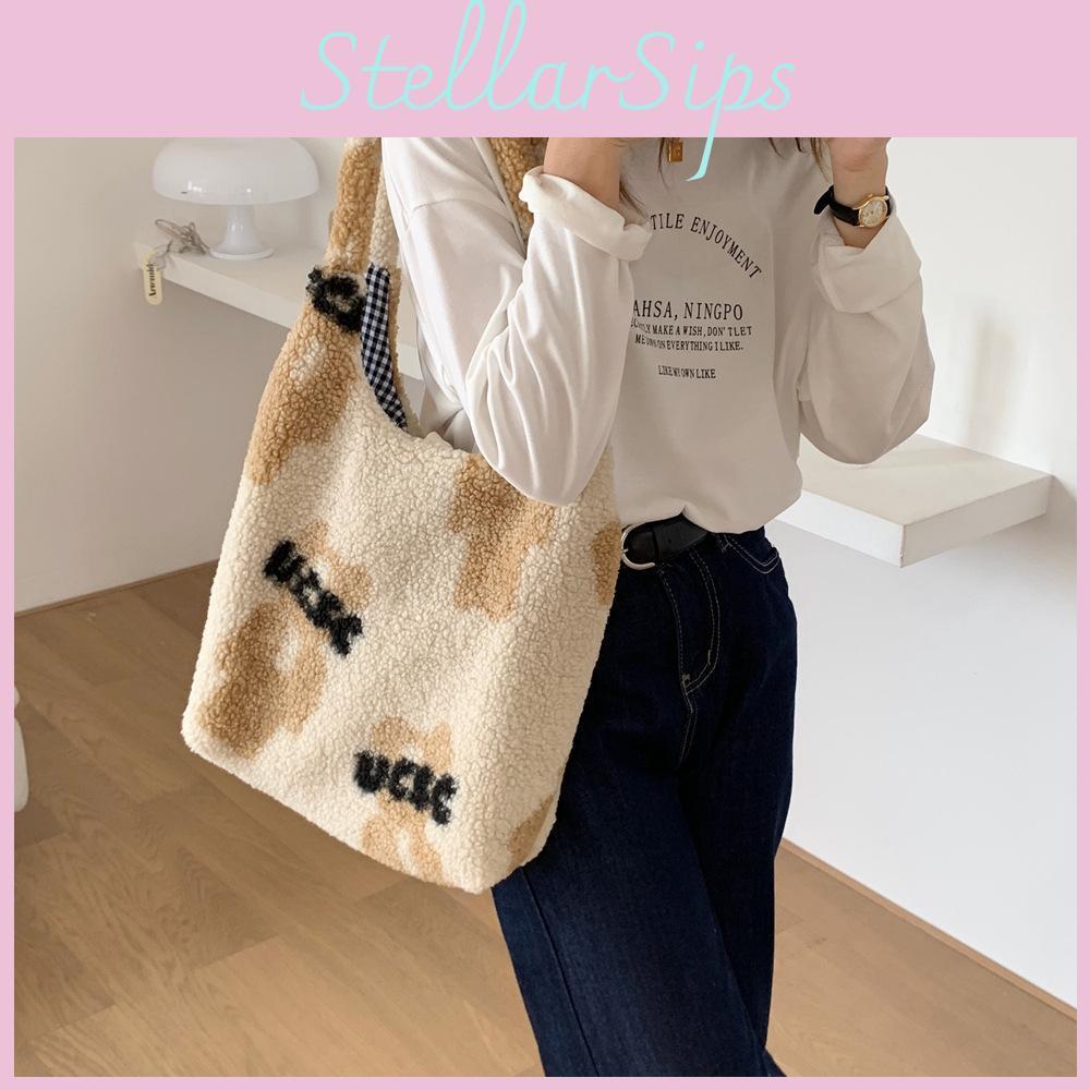 Stylish Plush Teddy Bear Tote Bag Soft Lambswool Large Capacity Everyday Purse