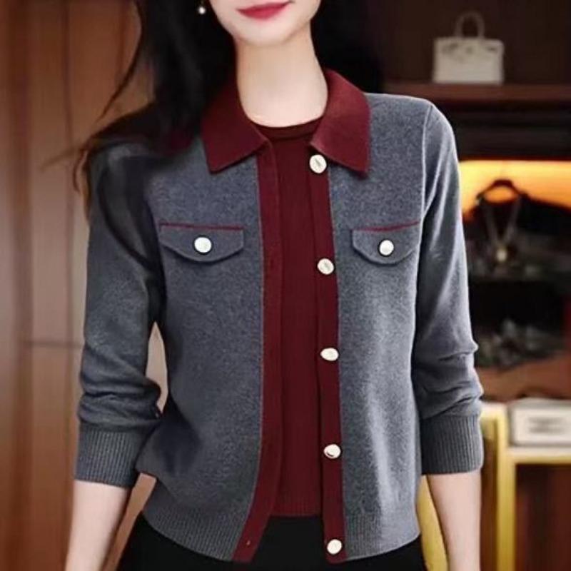 Fake Two-piece Color-blocked Sweater for Women Fashion Spring Autumn Outer Wear POLO Lapel Loose Short Knitted Top