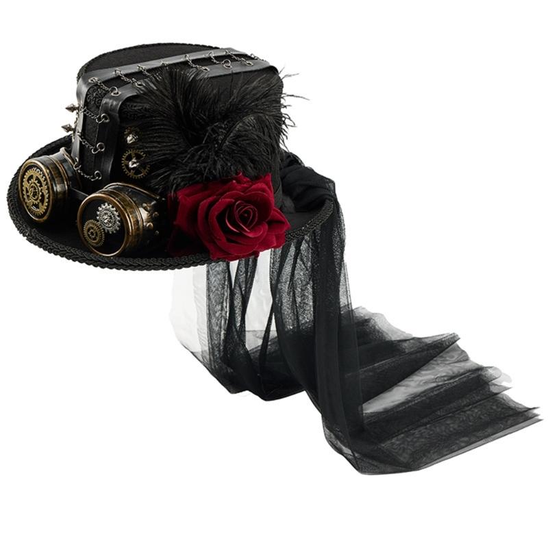 Gothic Metal Gear Hat Costume Accessory With Goggles and Rose Flower Long Veil Magicians Tall Hat for Theme Event