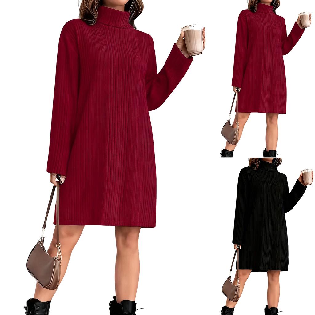 Women's Loose And Comfortable Warm Ribbed High-Neck And Long Sleeve Dress