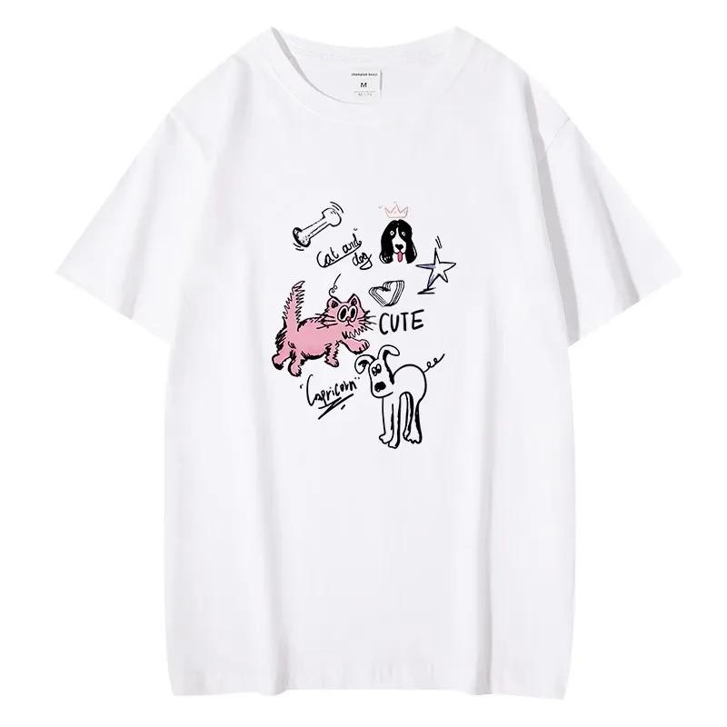 Summer Autumn Girl Korean Style T Shirt Cute Kitten and Puppy Graphic Print Fit Soft Y2k Casual Tee Kawaii Clothes Women Clothes