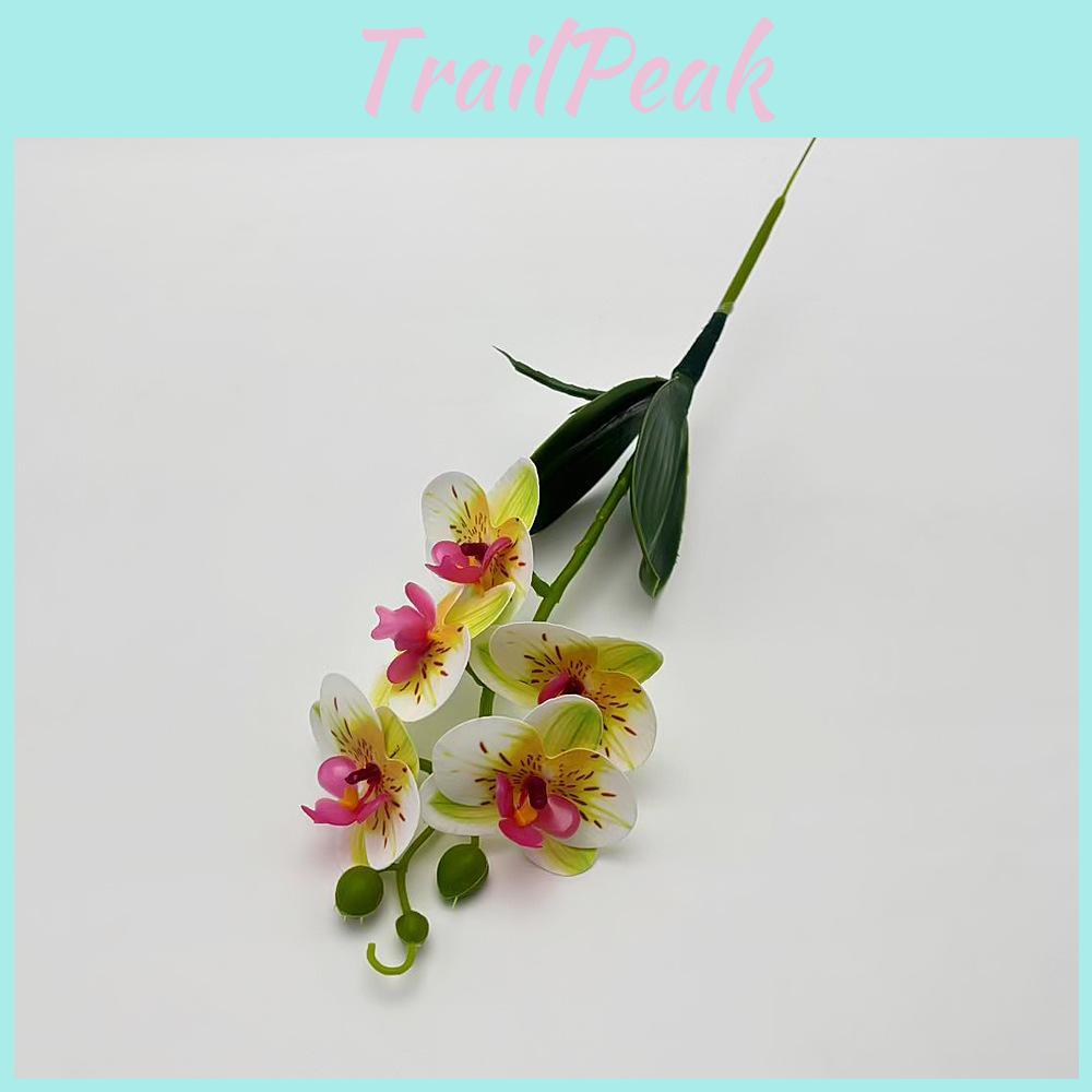This artificial orchid features five elegant butterfly-shaped blossoms with attached leaves, designed to enhance wedding, event, or home dcor. Crafted with a fixed-form technique,constructed from durable, lightweight materials. Ideal for outdoor celebrations, photo shoots, or interior decoration, this versatile floral accent adds vibrant color with options in purple-white, orange-yellow, green-white, black-purple, patterned purple, and solid purple. Wipe clean with a damp cloth to maintain its appearance.