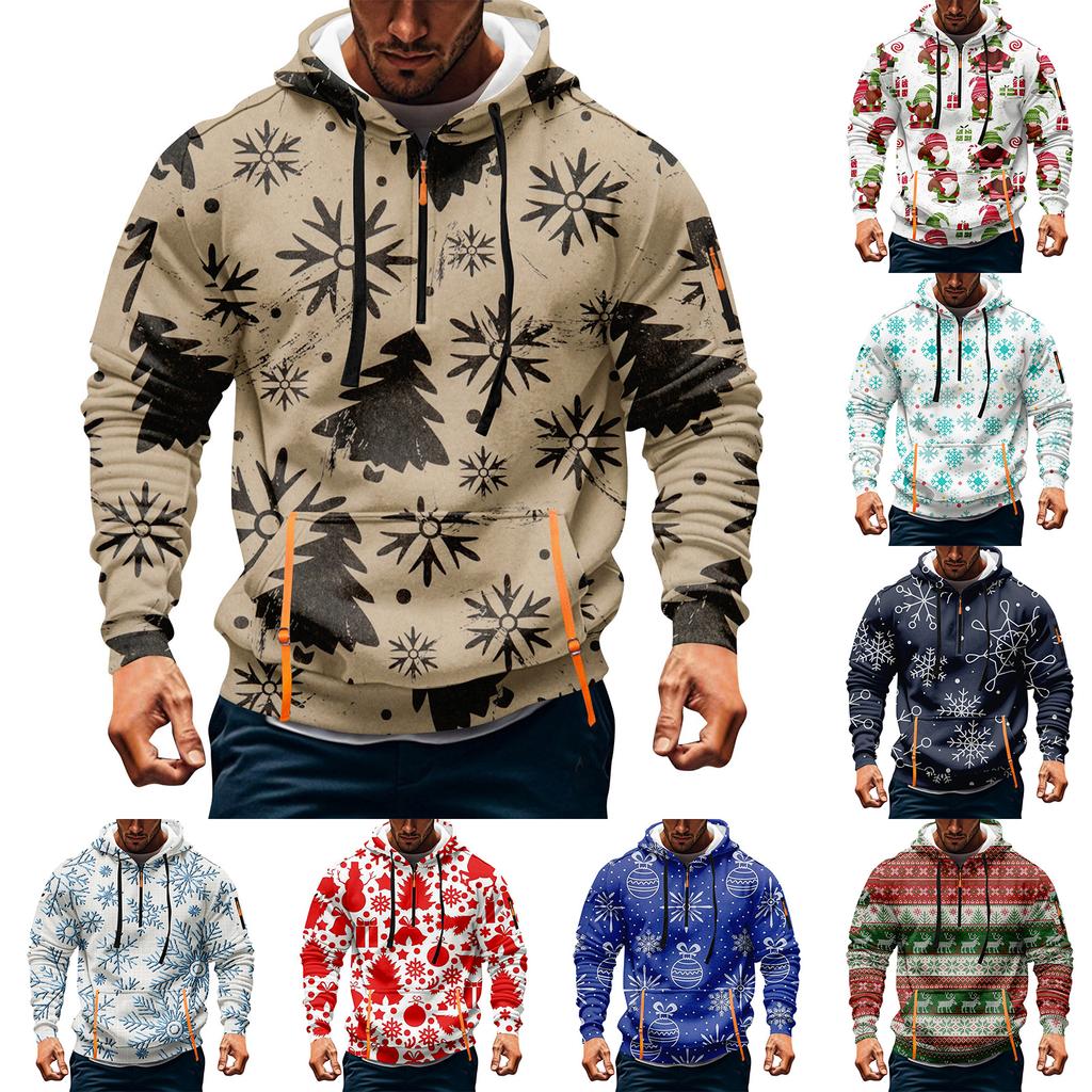Men's Christmas Print Hooded Half-Zip Casual Sports Sweatshirt