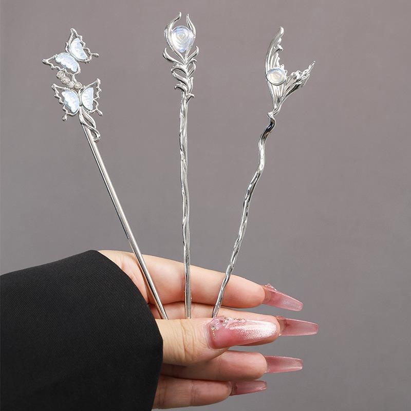 New Chinese Style Moonstone Women's Alloy Hairpin with Ancient Style Butterfly Tail Liquid Metal Advanced Fashion Headwear