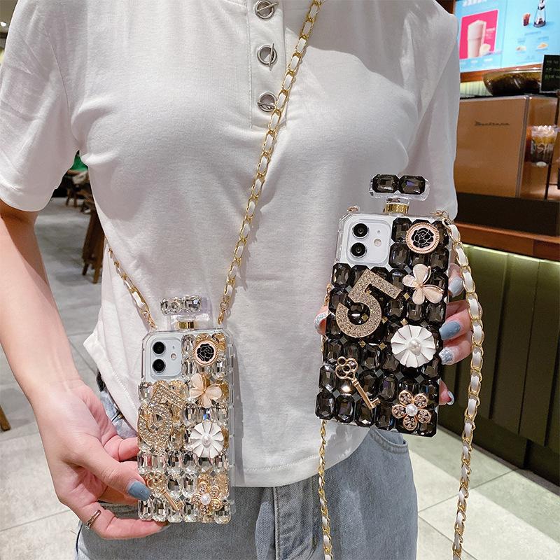 Full Diamond Perfume Bottle Phone Case for IPhone17Promax Crossbody Cord for Apple 16 Flower Key Luxury 14