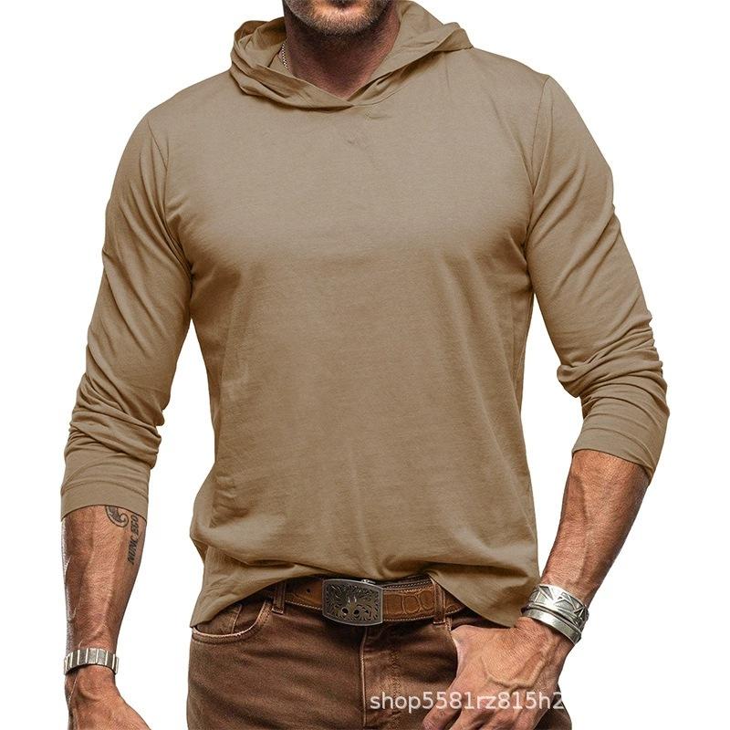 Men's Autumn Winter Solid Color Long Sleeve T-Shirt Pure Cotton Hooded Base Shirt Outdoor Top Basic Style