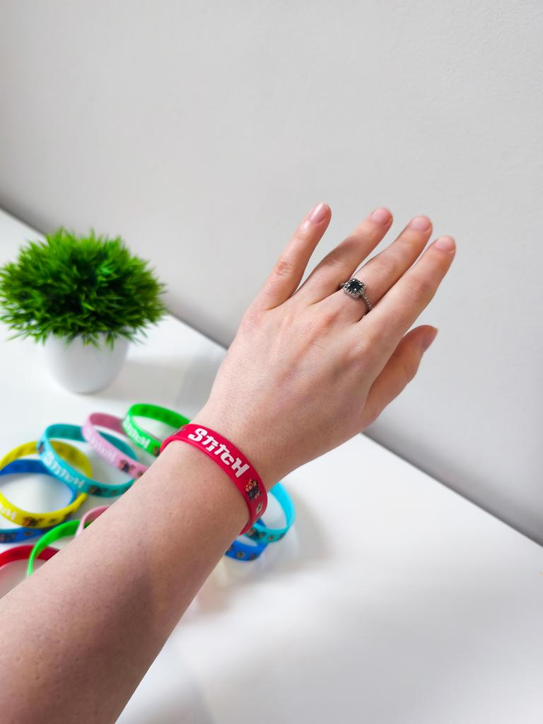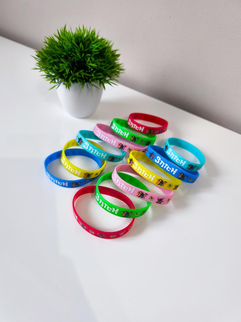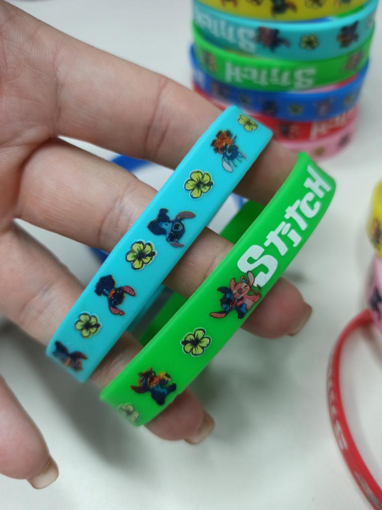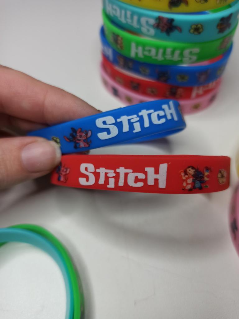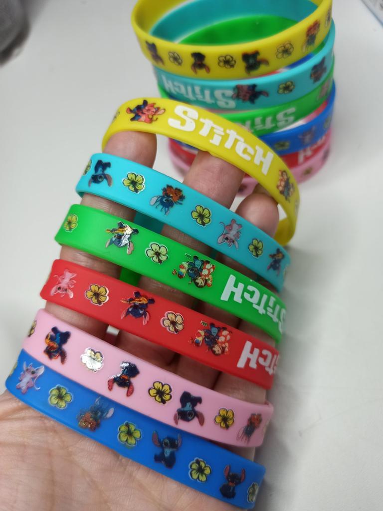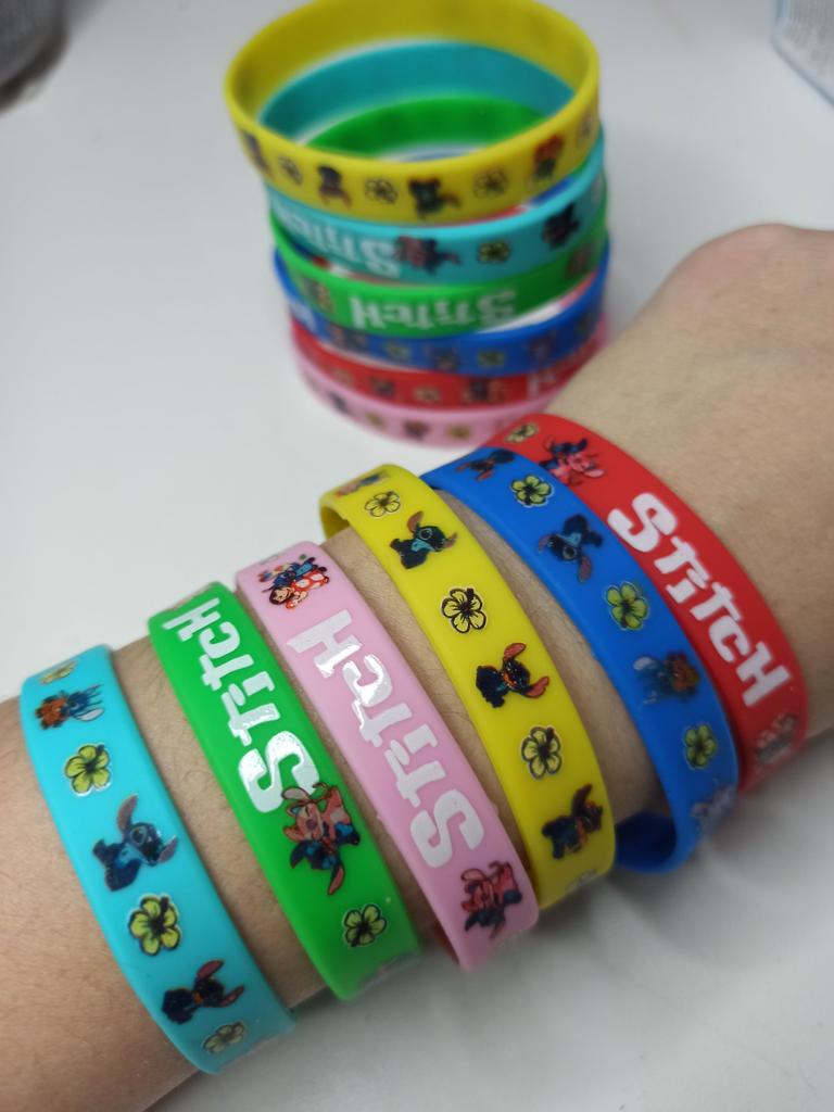 Colorful Design: The set includes a variety of vibrant colors such as pink, blue, green, yellow, and red. Stitch Theme: Each bracelet features graphics of the character Stitch along with tropical flowers and the name "Stitch" in a stylized font. Material: They are made of flexible and soft silicone, which makes them water-resistant and comfortable for daily use. Versatility: They are perfect as details for birthday parties, gifts for guests or simply to exchange with friends.