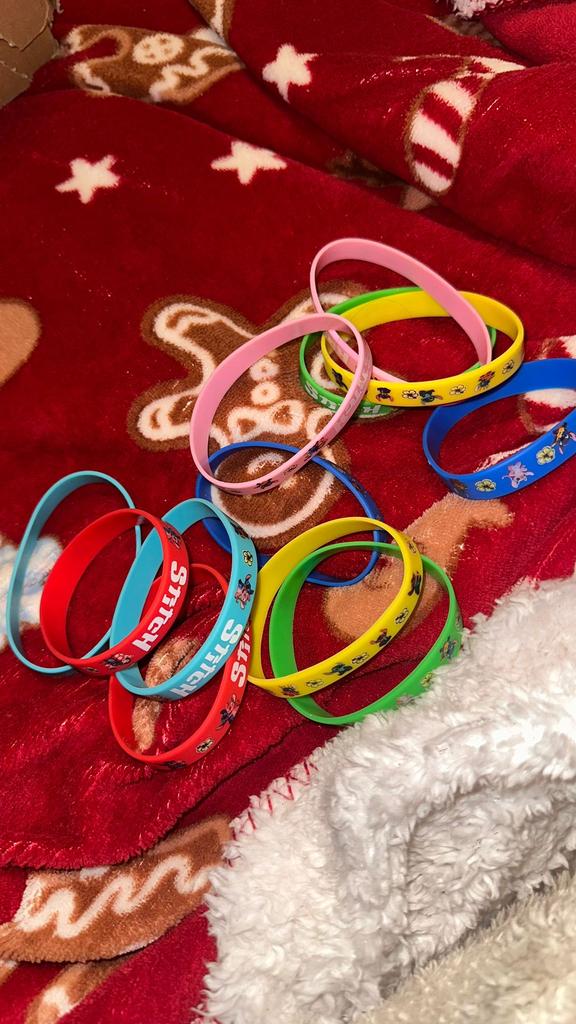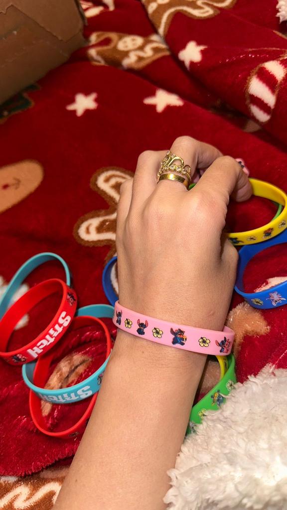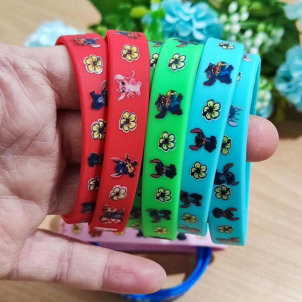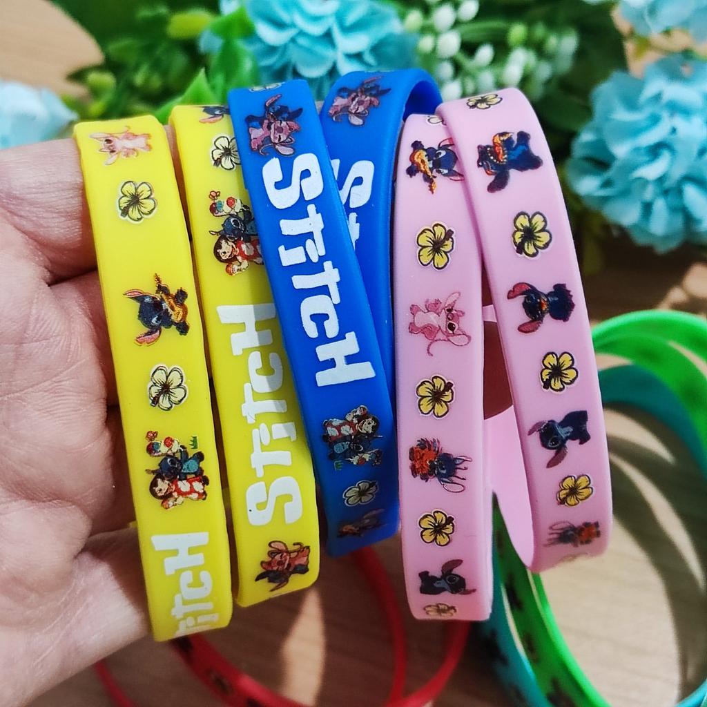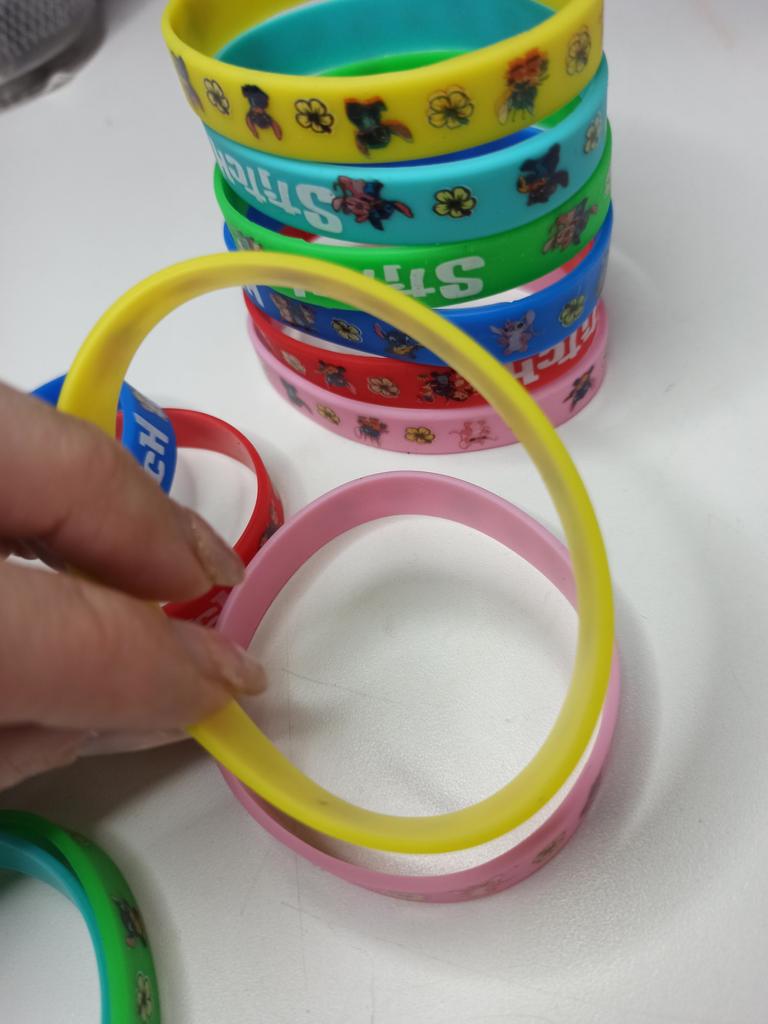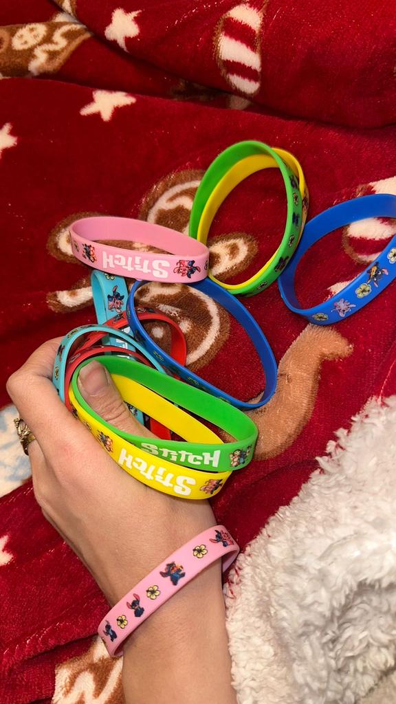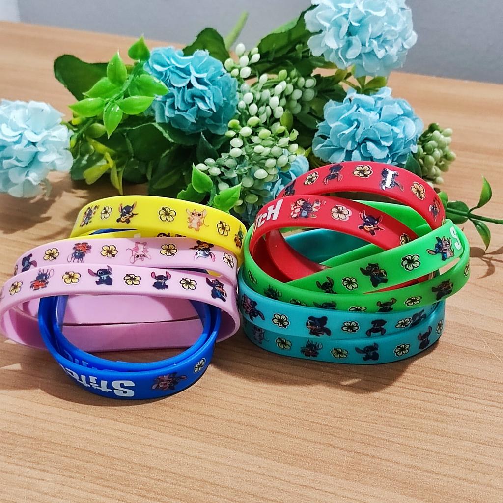 Colorful Design: The set includes a variety of vibrant colors such as pink, blue, green, yellow, and red. Stitch Theme: Each bracelet features graphics of the character Stitch along with tropical flowers and the name "Stitch" in a stylized font. Material: They are made of flexible and soft silicone, which makes them water-resistant and comfortable for daily use. Versatility: They are perfect as details for birthday parties, gifts for guests or simply to exchange with friends.