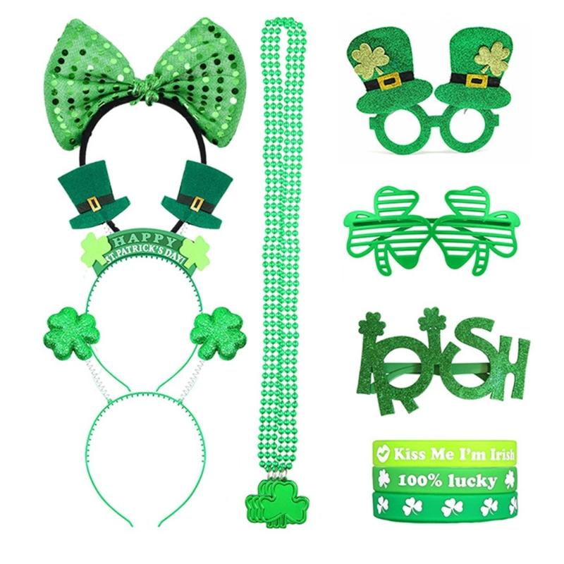 St Patricks Day Women Shamrock Headband with Bangles&Beads Necklace&Glasses Festival Costume for Cosplay Performances