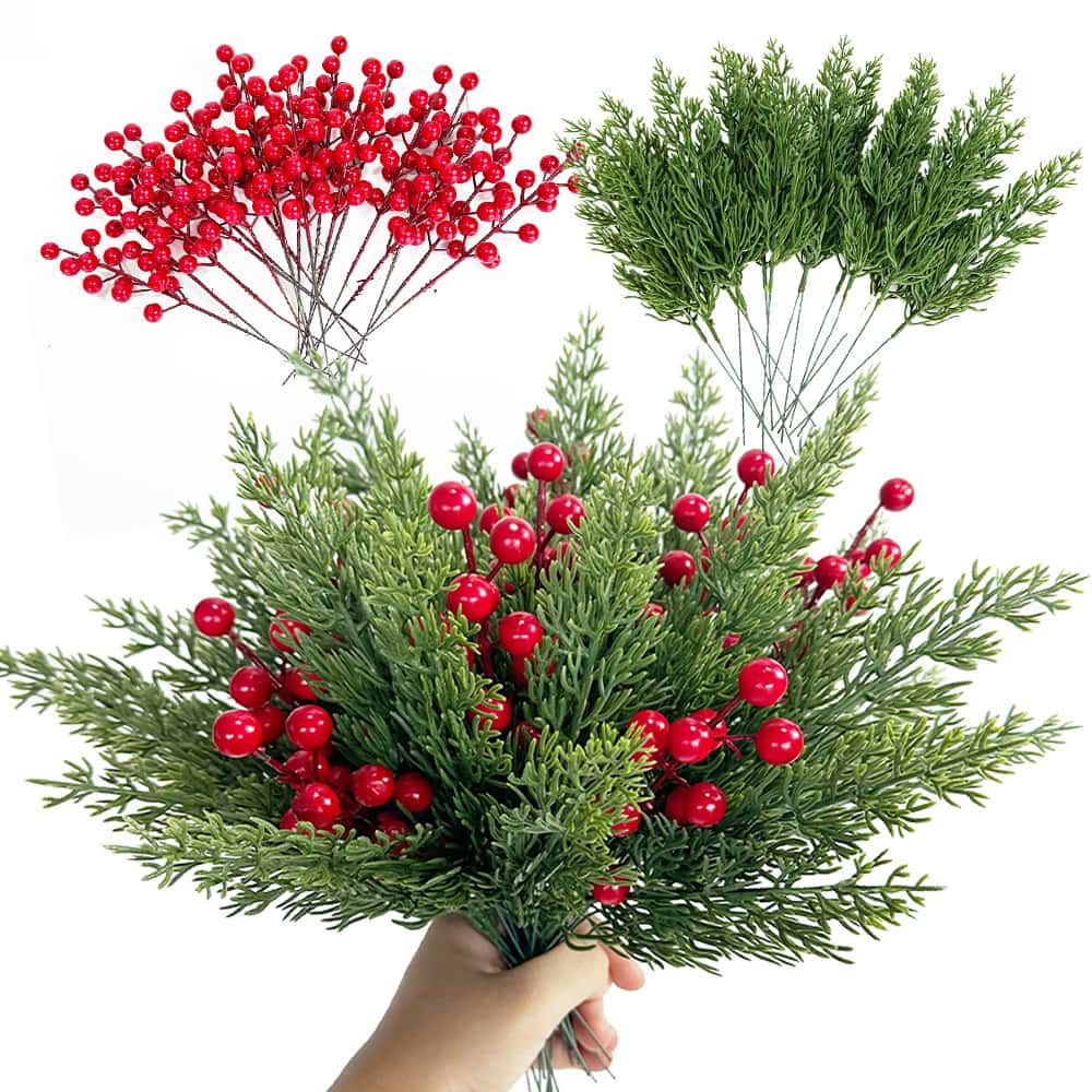 20/40/68pcs Christmas Decorative Flowers Red Berry Stems Artificial Pine Branches Fake Green Plant Pine Leaf Picks DIY