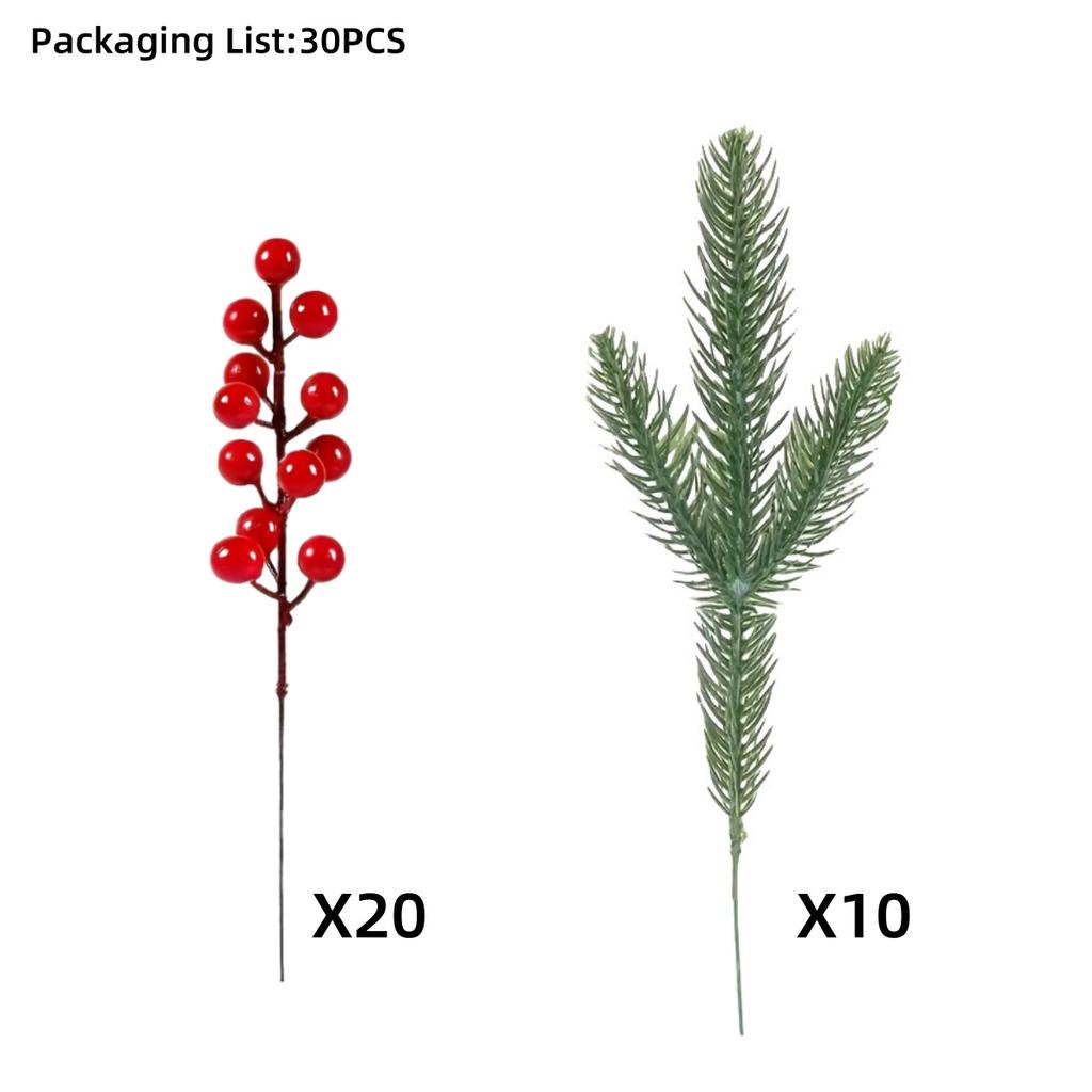 30PCS Artificial Christmas Pine Branches with Red Berries, Plastic,DIY Wreath Making Supplies for Home Holiday Decor