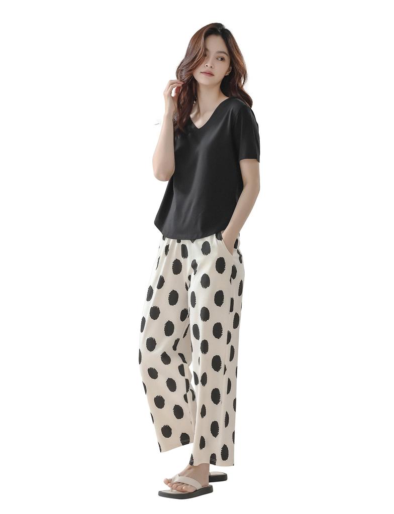 Made from a blend of cotton and spandex, it is stretchy and cool to wear, making it ideal for spring and summer loungewear.