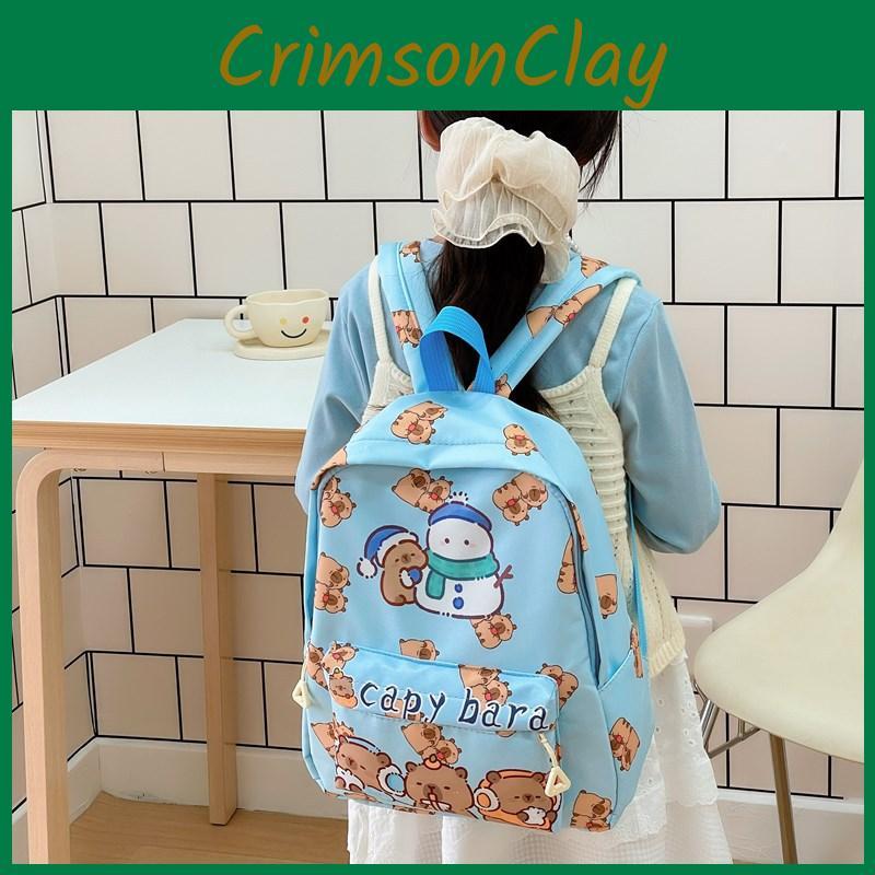 This children's backpack features a playful capybara design, combining fun animal patterns with vibrant colors like pink, blue, purple, and khaki. Crafted from durable nylon with a polyester lining, supporting daily use. Its breathable construction enhances comfort during kindergarten activities. Suitable for daily outings, it offers ample storage for school essentials. Easy to maintain, wipe clean with a damp cloth for long-lasting freshness.