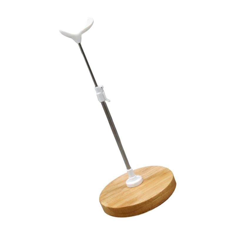 Stable wooden doll stand holder with adjustable height ensures secure display for various sized dolls, use selected wood, plastic, and metal for longlasting stability.