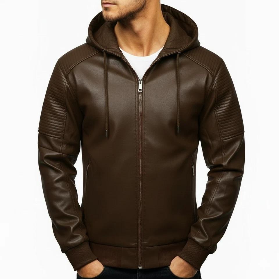 Brown Slim Fit Biker Hoodie Jacket Helloween Classic Lambskin Men's Leather Casual Handmade