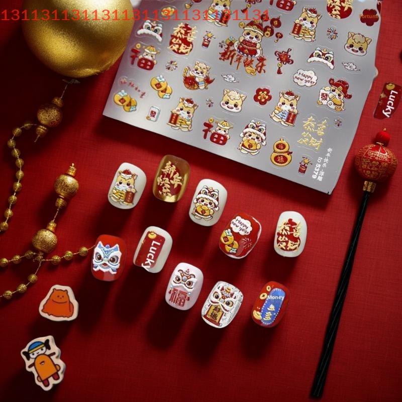 Adorable Year of the Horse Nail Stickers Lion Dance Art Print, Chinese New Year Manicure Decals Bow-themed