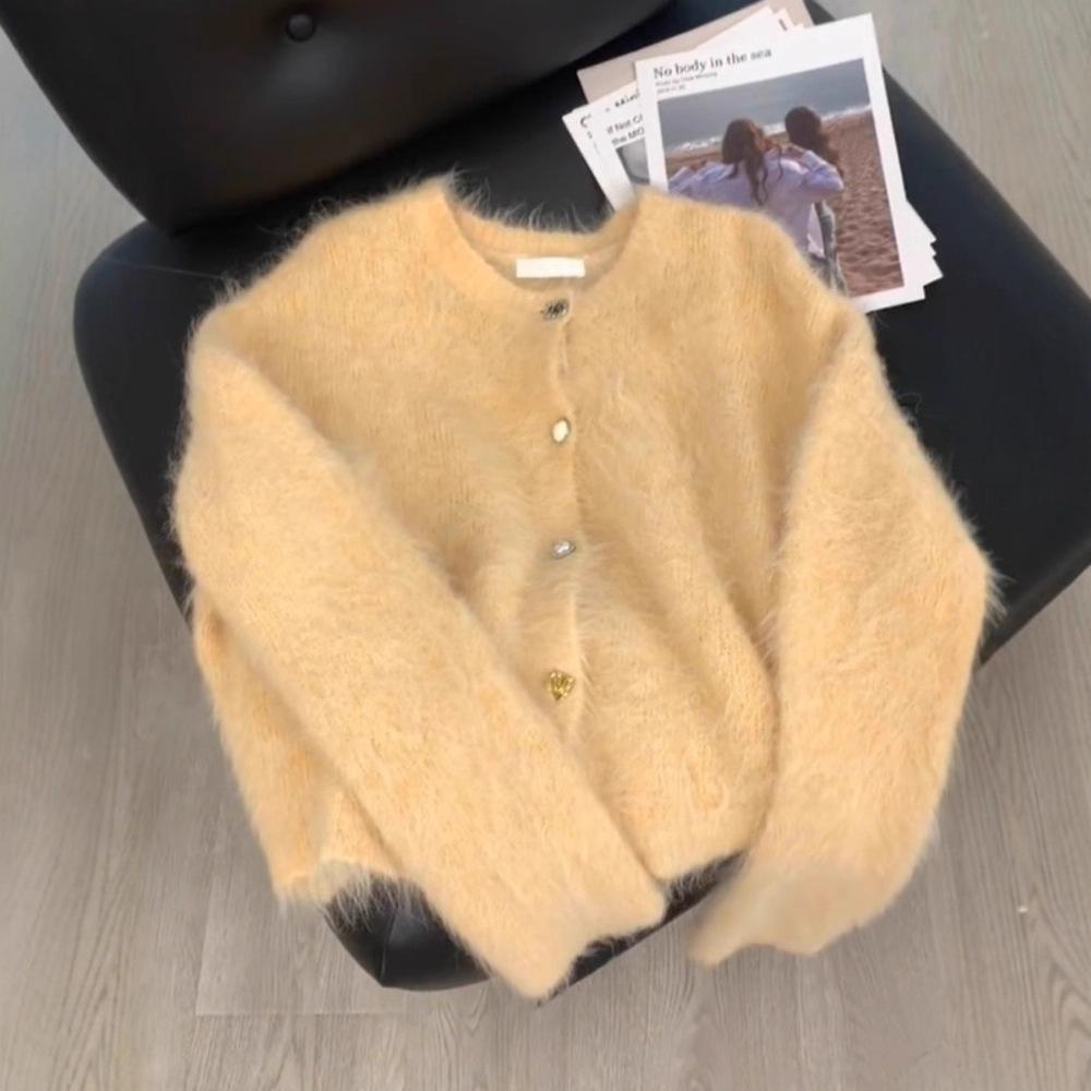 Milk Yellow Soft Waxy Imitation Mink Fleece Sweater Women's Autumn and Winter New Niche Design Single-breasted Knitted Cardigan