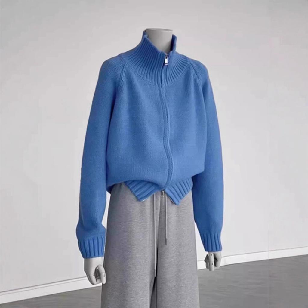 Lazy Wind Double Zipper Sweater Jacket Women's Autumn and Winter New Small Thickened Loose High Neck Knitted Cardigan