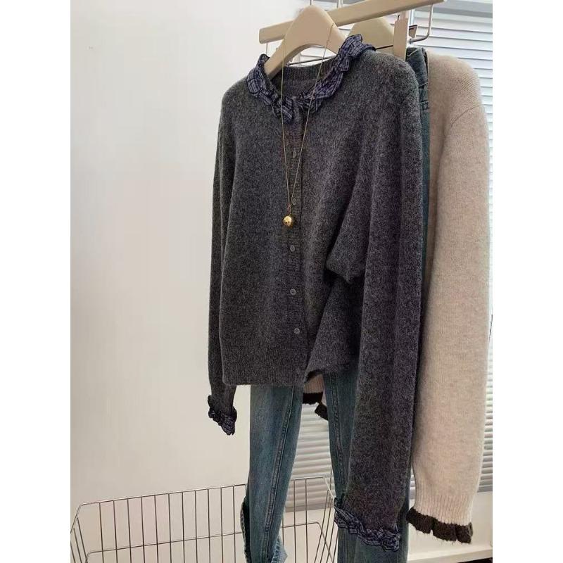 Dark Gray Plaid Fungus Edge Long-sleeved Knitted Cardigan Sweater Jacket with Women's Temperament Top New
