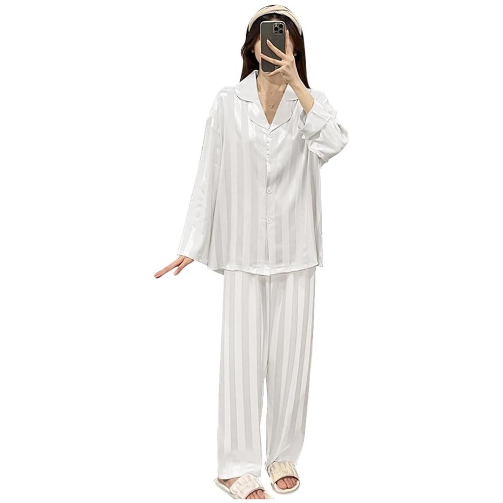 [Women's 2-Piece Pajama Set] This stylish two-piece set features a simple striped collar and long pants, providing comfort and ease of movement. The slight sheen adds a touch of luxury and cuteness! This silk-like loungewear is smooth and comfortable to wear! While designed for spring, autumn, and early winter, it's also great for summer in air-conditioned rooms. It's comfortable against the skin and absorbs sweat, making it a great choice for early summer and fall.