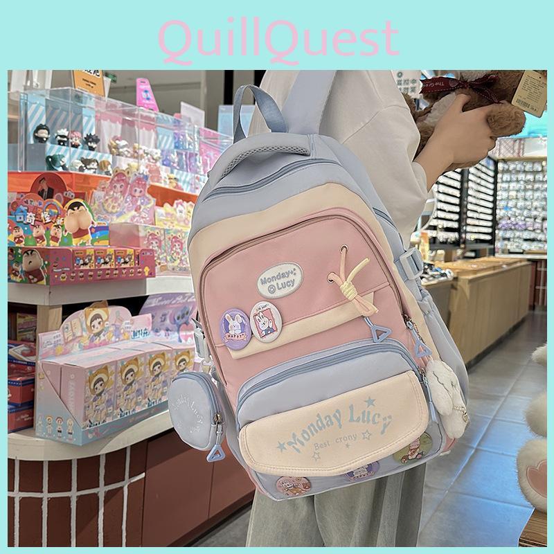 Simple Color Blocked Letter Pattern Student Backpack With Badge And Pendant For School And Daily Use