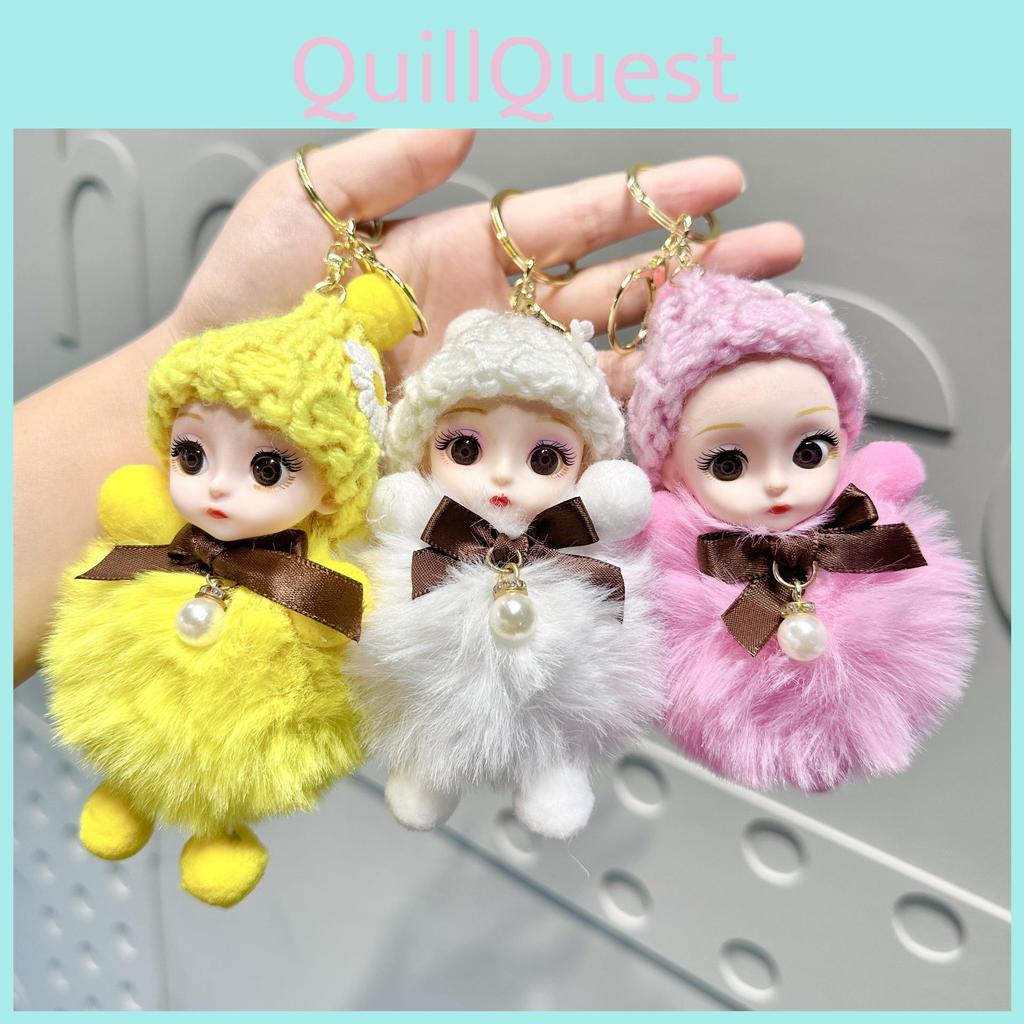 Soft And Cuddly Plush Big-eyed Doll Keychain Charm In Various Sweet Bow Colors