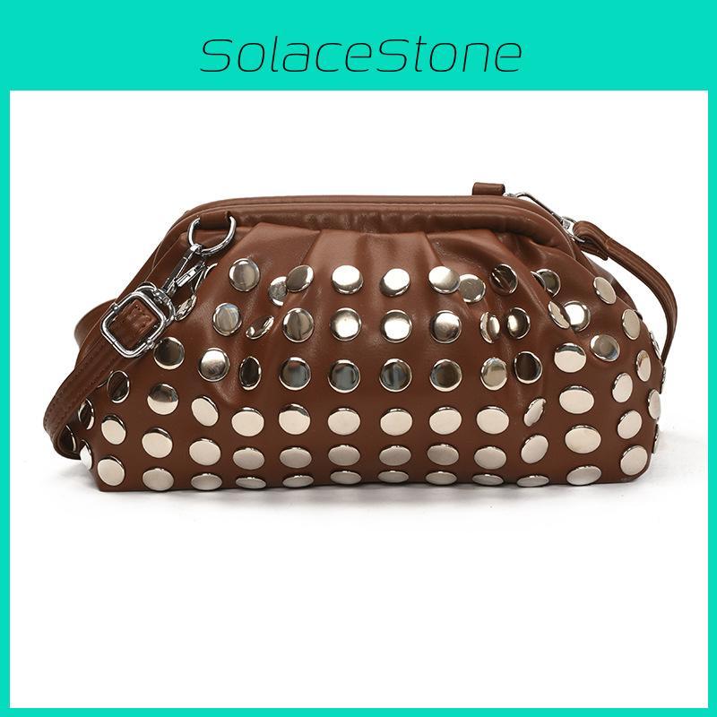 This modern retro-inspired shell-shaped shoulder bag features a durable PU material, offering a medium size suitable for daily use. The bag is accented with rivets and topstitched details, providing a fashionable yet sturdy look. Its soft structure includes a main compartment with a secure lock clasp and an internal phone pocket for organized storage. Ideal for everyday outings, casual events, or shopping trips, users will appreciate its stylish design and practical capacity. Wipe with a damp cloth to maintain its appearance.