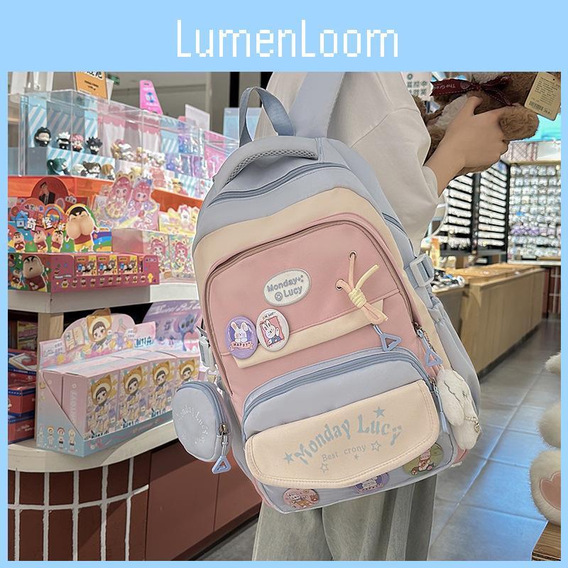Simple Color Blocked Letter Pattern Student Backpack With Badge And Pendant For School And Daily Use