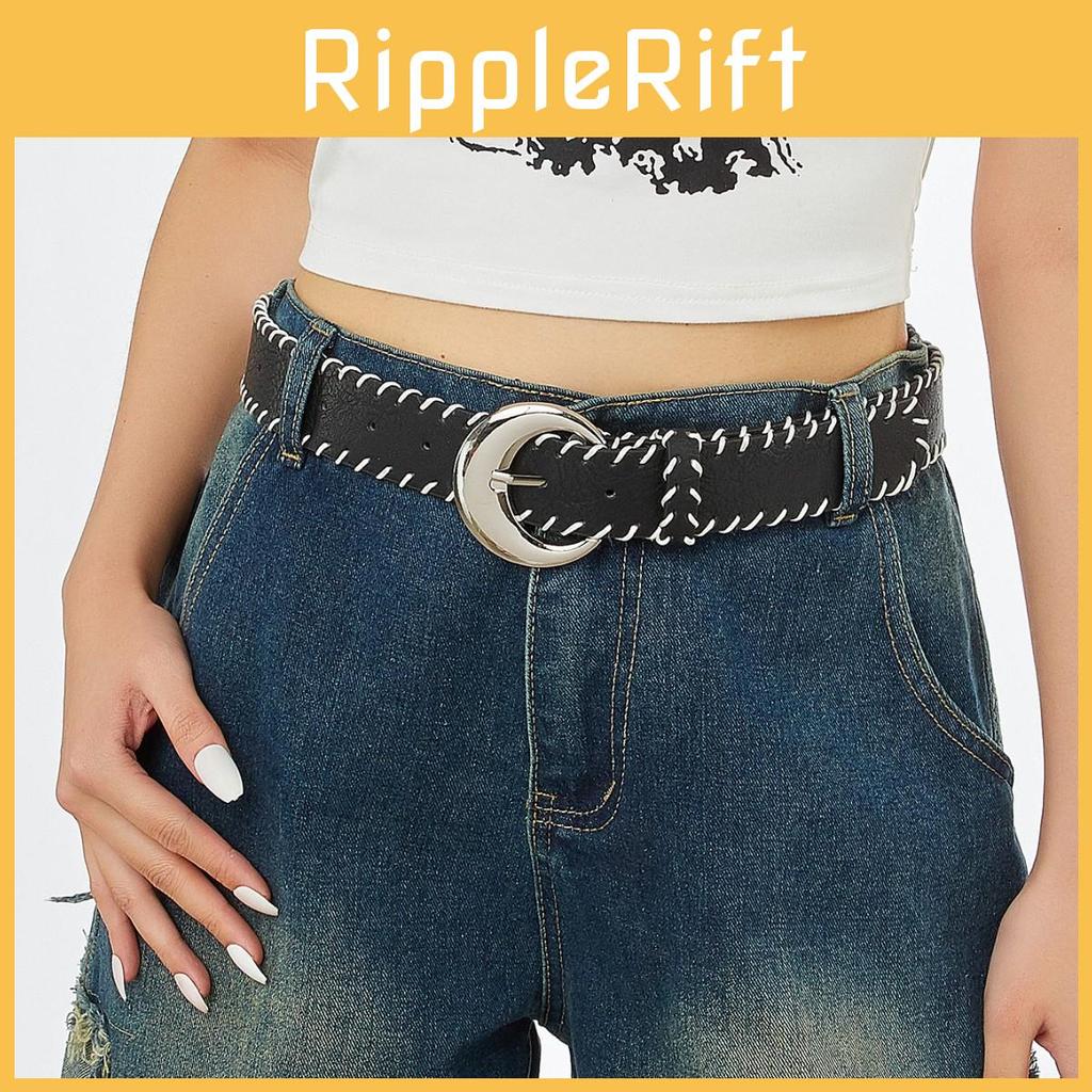 This women's fashion belt features a durable PU leather construction with a width of over 3.3cm and a length of 103cm, ideal for pairing with jeans or casual attire. The belt showcases a needle buckle closure and handcrafted white cord details, delivering a vintage-inspired look. Suitable for daily wear and fashion-forward outfits, it is easy to maintain with a wipe-clean cloth.