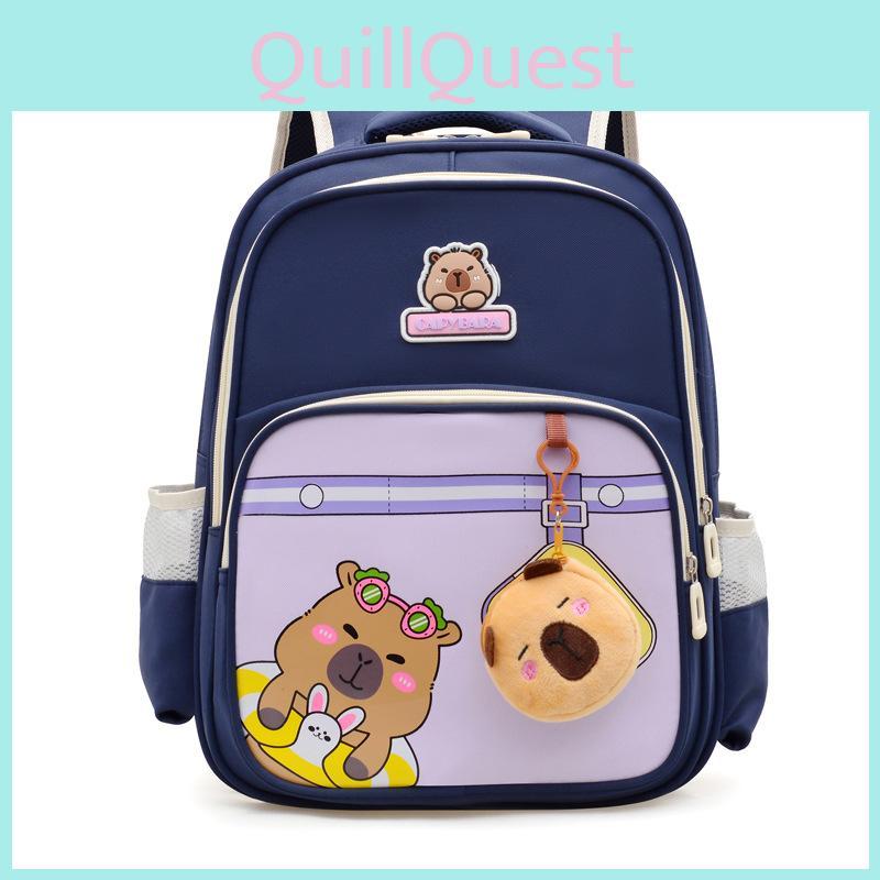 This lightweight kids' backpack features a colorful cartoon capybara design made from durable nylon material, includes breathable padded shoulder straps for comfort. Designed to support school activities, it offers ample storage for daily essentials. Wipe clean with a damp cloth to maintain its appearance.
