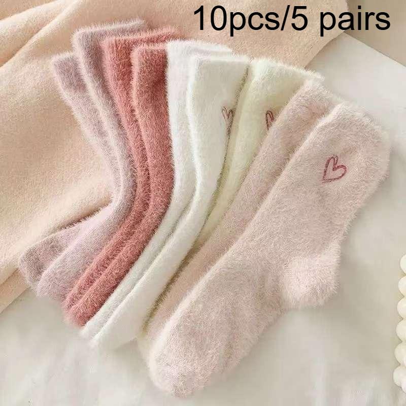 10pcs/5 Pairs Plush Double Heart Women's Mid-Calf Thickened Warm Winter Floor Socks,Stockings Suitable for Camping,long Sock