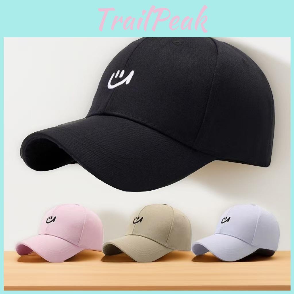 This Korean style happy face baseball cap features a breathable polyester-cotton blend with embroidered facial details, providing comfort and style. The adjustable strap ensures a snug fit, for versatile sizing. Suitable for casual outdoor wear in all seasons, it offers effective sun shading and ventilation. Wipe clean with a damp cloth to maintain its design and fabric quality.