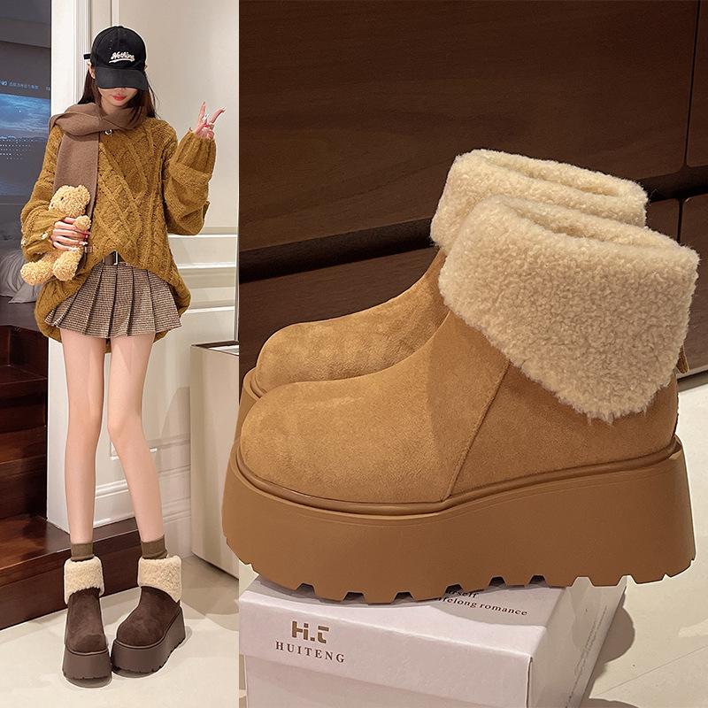 Leather Thick-soled Heightening Snow Boots Women's New Winter Piled Thickened Warm Fluffy Short Boots Cotton Shoes