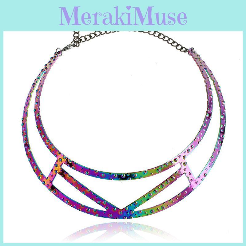 This fashion metal collar features a geometric open design crafted from electroplated iron,Its vibrant colorsiridescent, silver, and goldhighlight its bold, modern style. Ideal for styling with casual or office outfits, it adds a statement touch. Wipe clean with a soft cloth to maintain its finish.