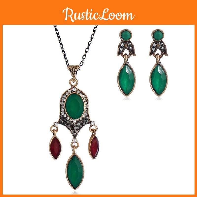 This vintage alloy pendant necklace and earrings set features a geometric design with green and black resin, combining style and durability. Made of alloy with electroplating, Perfect for everyday wear or gifting, it suits both men and women. Users can gently wipe the surface with a soft cloth for maintenance.