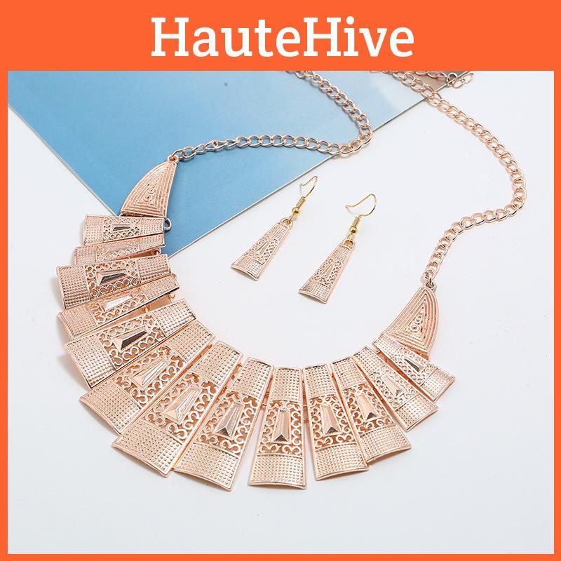 This vintage-inspired jewelry set features a geometric alloy design with hollow accents, including a necklace and matching earrings. and available in white gold, gold, rose gold, and antique silver colors. Ideal for adding a distinctive touch to casual or formal outfits,To maintain its appearance, wipe clean with a soft cloth.