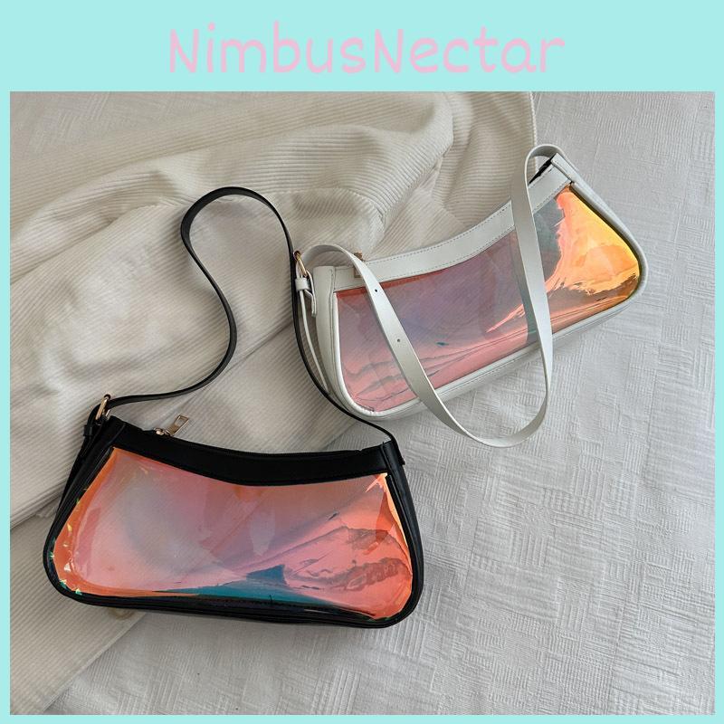 This stylish small shoulder bag features a transparent PVC construction with a laser element, enhancing its modern streetwear appeal. Measuring approximately 28.5cm in width and 13.5cm in height, it offers a compact yet functional design suitable for daily use. The bag employs a secure zipper closure and includes an interior polyester lining with an inner slip pocket for organization, providing reliable storage for essentials.