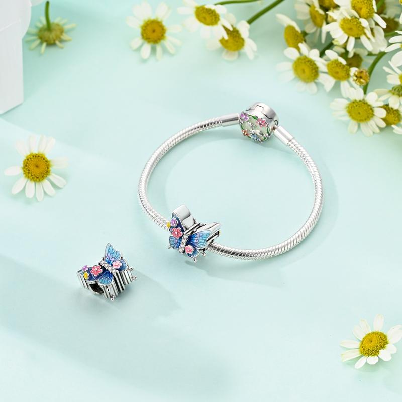 New Copper Heart Murano Glass & Butterfly Dangle Charm Fit Original Bracelet & Necklace Blue Series Jewelry