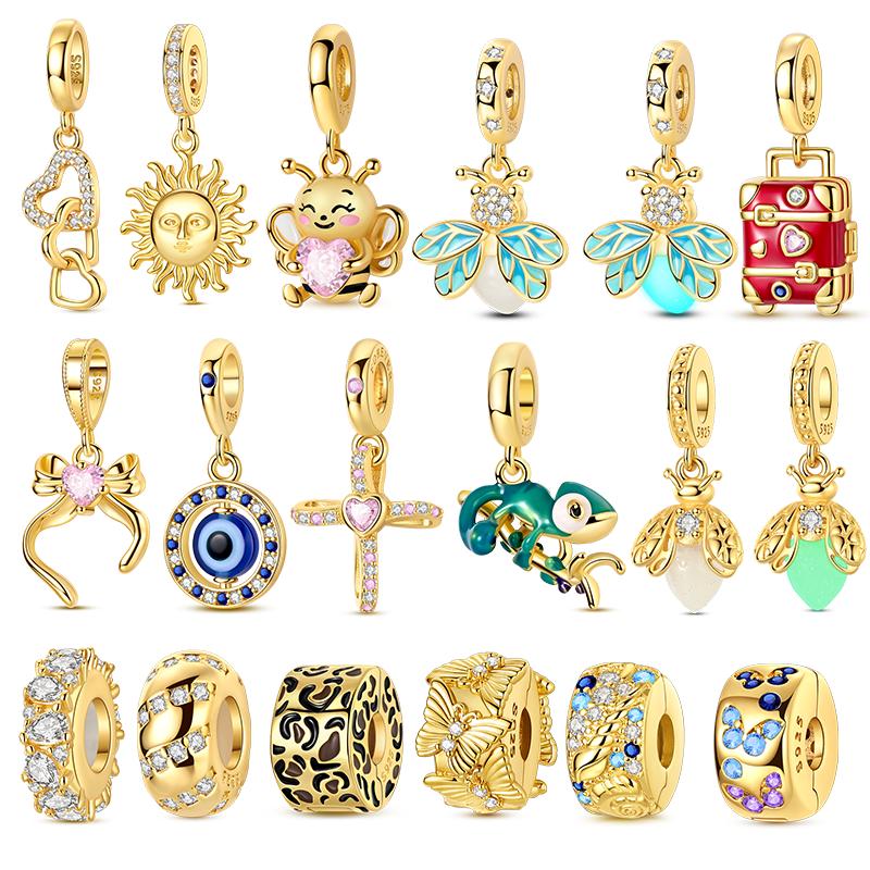 Copper Charms Beads Golden Sun Bee Bow Cross Firefly Chameleon Dangle Fit Women Original Bracelet Diy Gift