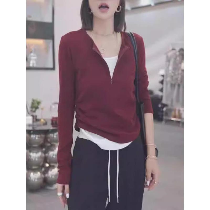 Retro Unique Fake Two-piece Invisible Half-zipper Long-sleeved T-shirt Women's Autumn Popular Pleated Thin Bottoming Shirt