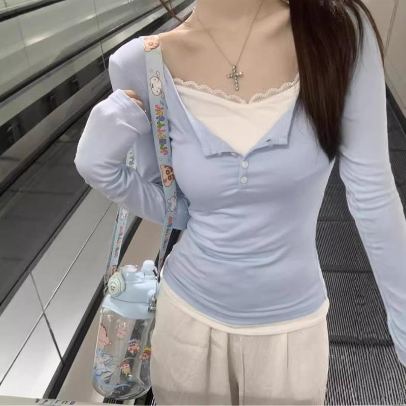 Sweet Age-reducing Fake Two-piece Lace Splicing Long-sleeved Shirt for Women's Autumn Slim-fitting and Thin Pure Desire Bottoming Top